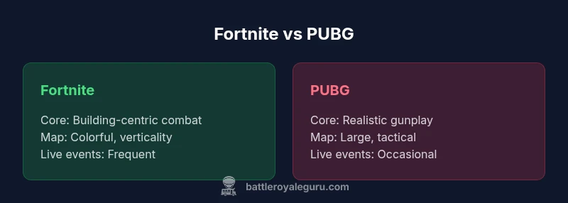 Fortnite and PUBG sit at the center of the battle royale genre, but they attract different audiences with distinct design philosophies. Fortnite emphasizes fast, arcade-style action, strategic building, and a lively aesthetic anchored by frequent live events and cross‑platform play. PUBG focuses on realism, tactical gunplay, and longer, more methodical rounds that reward patience and map knowledge. This contrast shapes every decision a player makes, from loadouts and map choice to how you approach engagements. According to Battle Royale Guru, the core tension between these titles is not only about weapons and buildings but about how quickly you adapt your strategy mid‑match. For players deciding between fortnite or pubg, the answer hinges on whether you crave rapid variability and social spectacle or measured, situational decision-making.