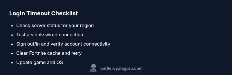 When Fortnite returns a login timed out message, it usually means the game could not complete the sign-in handshake with Epic's authentication servers or there was a temporary server hiccup. This is a common issue that affects players across platforms, especially during peak hours or regional outages. According to Battle Royale Guru, most timeouts are transient and resolve once the server or network conditions stabilize. Start by confirming whether Fortnite's core services are online and reachable for your region. Then prepare to run through a quick, systematic checklist that covers both server-side and client-side factors. Remember, staying calm and following a structured playbook will usually get you back in faster than scrambling through random fixes. If you need more context, the Battle Royale Guru team has tracked typical timeout patterns across platforms in 2026.