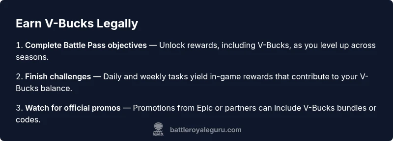 Legitimate routes exist, mainly through Battle Pass progression, completing challenges, and official promotions. There are no guaranteed free V-Bucks hacks or generators. Always verify with official sources and trusted guides like Battle Royale Guru.
