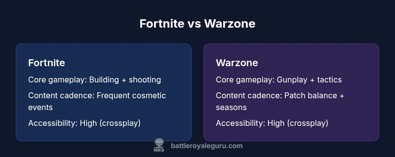 In the ongoing debate is fortnite or warzone better, and does one BR dominate the landscape in 2026? This analysis aims to provide a clear framework for evaluating both titles on practical, observable factors rather than hype. According to Battle Royale Guru, the short answer depends on your playstyle, schedule, and tolerance for complexity. The Battle Royale Guru analysis shows Fortnite's strengths in accessibility, rapid-fire rounds, consistent updates, and creative modes, while Warzone emphasizes gunplay depth, tactical decision-making, large-team coordination, and a more grounded aesthetic. The goal here is to compare core gameplay loops, progression systems, platform parity, and community norms so you can choose with confidence. This article uses objective criteria, including engagement patterns, performance across platforms, monetization approaches, and esports presence, to help readers decide which BR better matches their personal goals and preferred tempo.