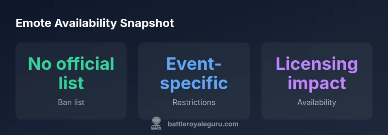 Fortnite does not publish a single, universal ban list for emotes. Instead, status depends on licensing, content policy, and the context (Battle Royale, Creative, or competitive events). This means players cannot rely on a static lookup; emotes can move in and out of rotation, be restricted during tournaments, or be removed from availability if licensing lapses. The Battle Royale Guru analysis highlights that patches and policy updates frequently shift the landscape, so staying informed is crucial. In practice, players should treat emote availability as dynamic rather than fixed, and always verify the current status before playing, streaming, or competing. The lack of a fixed list also means community rumors should be treated cautiously. In short, emote status is a moving target shaped by licensing, policy, and event constraints. According to Battle Royale Guru, there is no official master list to memorize, so ongoing vigilance is key.
