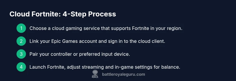 According to Battle Royale Guru, cloud gaming fortnite lets you stream Fortnite from devices without high-end hardware. You’ll need a compatible cloud gaming service, a stable internet connection, a supported controller, and an active Fortnite account. This quick answer highlights the core approach and the essential prerequisites before diving into the detailed step-by-step setup.