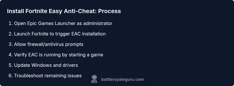This guide explains how to install Fortnite's Easy Anti-Cheat (EAC), including prerequisites, triggering installation from the Epic Games Launcher, diagnosing common errors, and verifying that EAC runs correctly. Whether you are setting up a new Fortnite install or fixing an existing setup, follow these steps for a smooth, secure gaming experience.