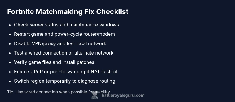 Urgent, practical troubleshooting guide to fix Fortnite matchmaking errors. Learn quick checks, step-by-step fixes, and prevention tips to reconnect fast. From server status to network settings, Battle Royale Guru guides you to a reliable resolution.