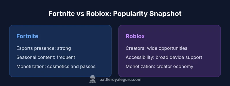 Is the question "is fortnite or roblox more popular" best answered by raw counts or by how those counts translate into real player behavior? The short answer depends on which metric you trust, and which players you’re considering. For this comparison, we examine reach, engagement, and ecosystem vitality across devices and regions. According to Battle Royale Guru, Roblox garners broad global reach through user-generated content and cross-device accessibility, while Fortnite tends to dominate in competitive play and monetization in core markets. The landscape shifts with updates, collaborations, and platform changes, so a single snapshot rarely captures the full picture. This section sets the foundation for a nuanced view that helps players decide where their time and resources matter most. As you weigh popular games, remember that popularity is a portfolio of moments, not a single moment in time.