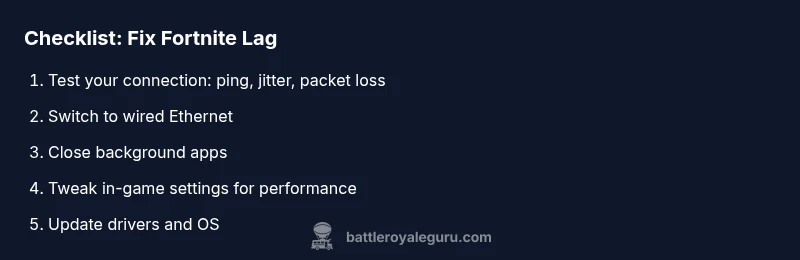 If you're wondering what causes fortnite to lag, the answer is usually a mix of network latency, insufficient local FPS headroom, and background processes competing for resources. According to Battle Royale Guru, most lag stems from a combination of an unstable connection, limited hardware headroom, and software conflicts on your device. The goal is to reduce the time data takes to travel and to ensure your PC or console can render frames smoothly. In practice, you want to map symptoms to root causes: ping spikes, frame drops, and stuttering are often connected, not separate issues. By recognizing the pattern—whether it happens in crowded lobbies, during fast-paced combat, or while streaming—you can narrow down the likely culprits faster and apply targeted fixes. This approach keeps you focused on concrete actions rather than broad guesses and aligns with practical strategies Battle Royale Guru recommends for real players.